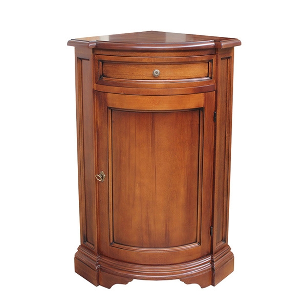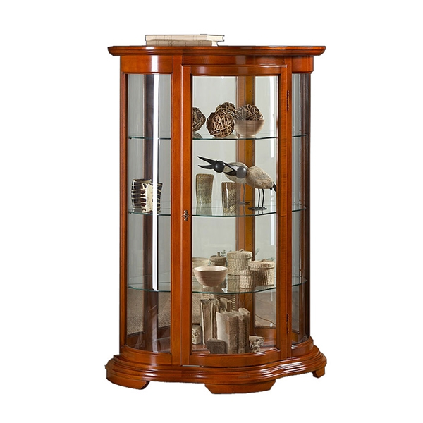 Classico mobile vetrina ad angolo ricco di stile e funzionalità.Un'anta inferiore, un comodo cassetto e un'anta sagomata a vetrinetta è quanto riesce ad offrire questo funzionale mobile nello spazio di un angolo.La sua forma è estremamente classica.Gli elementi di stile quali la radica e gli intarsi floreali ne fanno un mobile molto elegante che saprà valorizzare qualsiasi ambiente arredato con gusto. Vetrina ad angolo consegnata già montata. Dimensioni di ingombro:larghezza cm 80;altezza cm 200;lato appoggiato al muro cm 57.