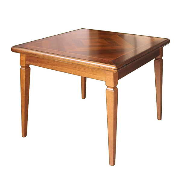 Tavolo intarsiato quadrato. Il lato del piano misura 100 cm ed è caratterizzato da un intarsio a spicchi dove la decisa venatura del legno di noce crea effetti estetici di gran classe. Ovviamente, trattandosi di intarsio in vero legno, ogni esemplare sarà "unico" e l'intarsio rappresentato in foto è molto indicativo per la struttura ed il taglio ma non può esserlo per lo sviluppo della venatura del legno. Rimane, tuttavia l'intrigante geometria del disegno che le venature del legno sanno creare grazie alla particolare composizione. Questo tavolo è dotato di gambe con sagoma curva accentuata. Ciò rende più decisa la sua stilizzazione rendendolo adatto, oltre che all'uso quotidiano, anche ad un contesto molto più classico. Le sue dimensioni possono essere estese, grazie al fatto di avere 2 allunghe laterali. Dimensioni chiuso: larghezza 100 cm; profondità 100 cm; altezza 78 cm. Dimensioni con allunghe: larghezza 180 cm; profondità 100 cm. Per questo articolo i tempi di attesa normali (15 giorni lavorativi) potrebbero subire un allungamento di alcuni giorni. L'attesa media per la preparazione di questo articolo potrebbe arrivare a 20 - 25 giorni.