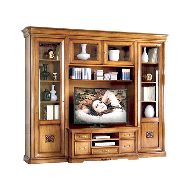 Parete tv soggiorno, parete tv componibile, arredamento zona giornoClassica, raffinata ed elegante: ecco come si presenta questa splendida composizione parete tv soggiorno.Ben lontana dalle approssimative composizioni in arte povera, tutte simili e di qualità scadente, questa parete è vera espressione della maestria artigiana di capaci mobilieri.La sua linea pulita rende questa composizione parete tv soggiorno un oggetto destinato a non passare di moda. In primo piano c'è la bellezza del legno, trattato con tinte che ne valorizzano le caratteristiche. Due motivi intagliati su legno massello di toulipier valorizzano le ante laterali e donano quel tocco di stile che completa un'opera di indubbio fascino.L'affidabilità di questo mobile da parete è davvero ai massimi livelli.Ogni composizione viene montata e poi smontata per verificarne la precisione ed affidabilità . Il montaggio, grazie alle chiare istruzioni fornite, risulta molto semplice e veloce.La struttura è costituita da materiali di prima scelta: struttura in listellare placcato toulipier da 18 mm;cornicioni, zoccolo, telaio e ante in legno massello di toulipier;Schienale in multistrato pioppo da 6 mm; cassetti lavorati a coda di rondine su legno massello e multistrati.L'installazione risulta estremamente facile perché anche questa composizione viene controllata accuratamente dal nostro personale, assemblata e smontata per verificare che tutta la fase di montaggio a cura del cliente sia priva di ogni più piccolo problema.Dimensioni di ingombro:larghezza cm 295; profondità cm 46; altezza cm 240;Dimensioni vano per Tv:larghezza cm 135; altezza cm 85;Il mobile viene fornito smontato con tutti gli accessori e chiare istruzioni per il montaggio.