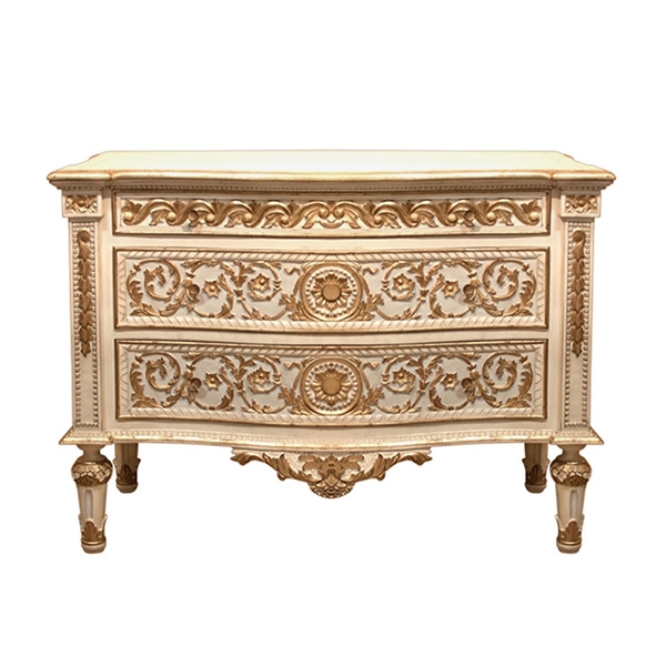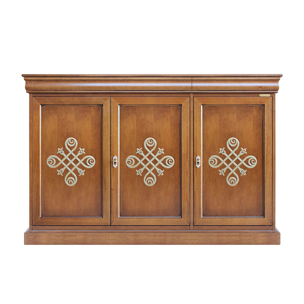 Classica credenza in stile Luigi Filippo efficacemente valorizzata da un bellissimo elemento decorativo al centro delle ante. Lo stile di questo bel mobile viene esaltato dalla classicità del motivo in rilievo, mettendo in risalto la delicatezza e l'equilibrio estetico del mobile. In versione uniforme il rilievo assume un carattere discreto ma presente. L'estrema pulizia della linea ne caratterizza l'eleganza. Con questa configurazione si presta ottimamente all'inserimento in ambienti arredati con piglio moderno e contemporaneo. Nella versione patinata, il rilievo viene particolarmente evidenziato e il mobile assume quell'aspetto "vissuto" tipico dell'autentico mobile in stile. Dimensioni: Larghezza cm 93; profondità cm 40; altezza cm 89,5.
