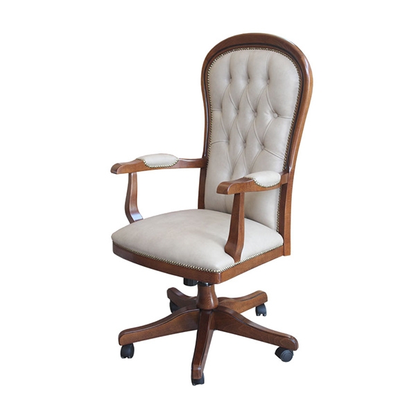 Raffinata poltrona girevole, estremamente classica, dona un tocco di grande eleganza ad un ufficio capace di farsi ricordare. La tonalità calda del legno del telaio racchiude con infinita bellezza l'imbottitura, realizzata magistralmente con materiali indeformabili di ottima qualità. Lo schienale lavorato a capitonné esalta la forma armoniosa della poltrona. L'ufficio che ospita questa poltrona acquista un elevato grado di stile che eleva a rango di ambiente raffinato la postazione di lavoro. Una poltrona unica, esclusiva, di grande valore. Un fantastico rapporto qualità prezzo per un oggetto impeccabile, a prova di confronto. Garantito da Arteferretto. Dimensioni: Altezza totale della poltrona: 120 cm. Altezza minima della seduta: 48 cm circa. Altezza minima dei braccioli da terra: 70 cm circa. Corsa pistone in altezza: 9 cm. Dimensioni seduta: prof. 50 x largh. frontale 65 cm Tempi d'attesa: 20-25 giorni lavorativi circa Altre poltrone girevoli disponibili